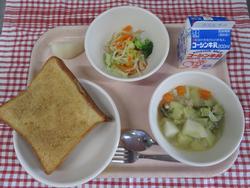 セサミトースト とりにくとやさいのスープに コーンサラダ なし ぎゅうにゅう |