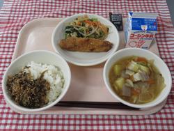 ごはん のりのつくだに ししゃものごまあげ ごもくきんぴら さといものみそしる ぎゅうにゅう |