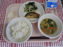 はいがパン さわらのラビゴットソースがけ あおのりポテト とうがんのわふうベジタブルスープ りんご ぎゅうにゅう |