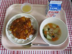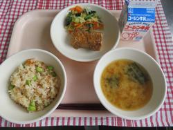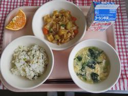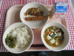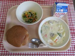 旬のアスパラガスを使ったクリームシチューです。1年生もしっかりたべていました。給食では、野菜、海藻、種実類など多くの食材を使用しますので、少しずつ慣れていけるといいですね。 | |