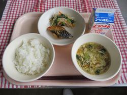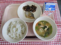 さばは、「ウスターソース、醤油、酒、三温糖、しょうが」で下味をつけ、オーブンで焼きました。「骨があった!骨もとってくれると思った!!」と1年生。魚は骨に気を付けて少しずつ食べるように声をかけています。 | |