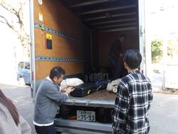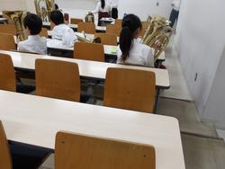 吹奏楽部の子どもたちは、学校に集合後、体育館で出発前の練習が始まりました。トラックが到着すると、楽器を運んでいただきました。