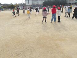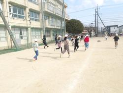 ロング昼休みになると、お天気になり、子ども達もいつの間にか上着を脱いで遊んでいました。赤白帽子を被っているのは3年生。学級でレクを楽しんでいました。最初は、ドッジボールからスタートです。