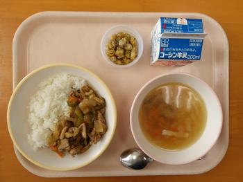 今日の給食は、「ぶたみそどん やさいスープ ポップビーンズ ぎゅうにゅう」でした。