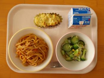 今日の給食は、「スパゲティポロネーゼ ブロッコリーサラダ スィートビーンズポテト ぎゅうにゅう」でした。