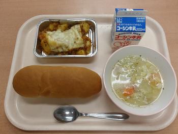 昨日の給食は、「コッペパン ポテトラザニア アルファベットスープ ぎゅうにゅう」でした。
