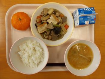 「いりどり」は、鶏肉の他にもごぼう、こんにゃく、生揚げ等の具が沢山入っていました。味が染みているので、ご飯もすすみました。昼休みに高学年の人と話していたら、みかんを2個食べたそうです。美味しかったけれども、口の中が冷たくなったとのことです。