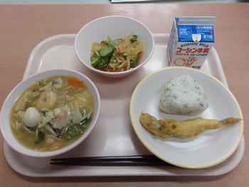 今日の給食は、「かんとんめん なめしおにぎり ししゃものフリッター だいこんのピリッとサラダ ぎゅうにゅう」でした。