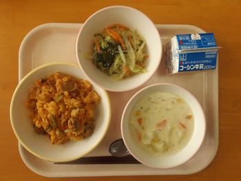 今日の給食は、「ジャンバラヤ はるさめサラダ クリームコーンスープ ぎゅうにゅう」でした。
