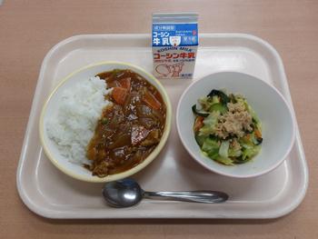 今日の給食は、「ハヤシライス かむかむサラダ ぎゅうにゅう」でした。