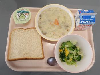 今日の給食は、「はいがしょくパン しろいんげんまめのシチュー ブロッコリーサラダ ラ・フランスゼリー ぎゅうにゅう」でした。
