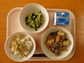 9月にも生揚げの胡麻煮が出ています。今回は、具の大きさを小さめにして少しでも食べやすいように工夫したと栄養士も張りきって準備していました。ご飯の上には卵ふりかけもあり、手作りの素朴な味がしました。