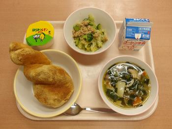 子どもたちが楽しみにしているきなこあげパンです。朝から献立表でメニューの確認をしたり、「楽しみ。」や「早く給食の時間がこないかなあ。」と伝えに来たりする程、心待ちにしているようでした。ウェーブわんたんスープも名前のとおり波に見えるようなワンタンが入っており、野菜類だけではないので食べやすかったのではないかと思っています。