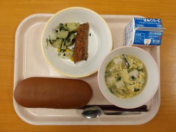 今日の給食は、「こくとうパン さけのカレーあげ ジャーマンポテト かきたまスープ ぎゅうにゅう」でした。