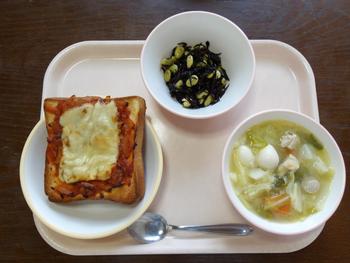 今日の給食は、「ピザトースト ポトフ ひじきあおだいず ぎゅうにゅう」でした。写真には、牛乳が載っていません。失礼しました。