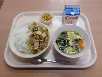 厚揚げ入り豚キムチパワー丼は、ラクビ―の選手が強い体を作り、また維持していくために必要な栄養が含まれた料理です。今日は、持久走大会がありました。運動して疲れた体には、今日のメニューはぴったりですね。4年生では、お替わりで全ての食缶が空になりました。カレー味のポップビーンズも大人気です。