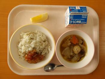 今日の給食は、「ガーリックライス とりにくのマーマレードやき ほかほかジューシーだいこんとにくだんごのスープ りんご ぎゅうにゅう」でした。