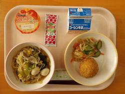 今日の給食は、「コーンラーメン ライスコロッケ だいこんのピリッとサラダ アップルゼリー ぎゅうにゅう」でした。