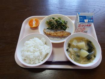 16日の給食は、「ごはん しろみさかなのこうみソースかけ こまつなのごまあえ みそしる みかん ぎゅうにゅう」でした。