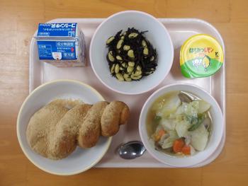 今日の給食は、「きなこあげパン やさいのスープに ひじきあおだいず はちみつレモンゼリー ぎゅうにゅう」でした。