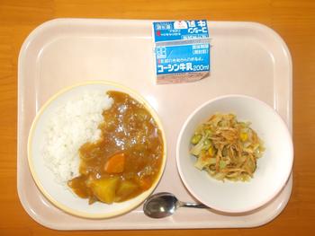 今日の給食は、「ポークカレーライス ごぼうとまめのサラダ ぎゅうにゅう」でした。