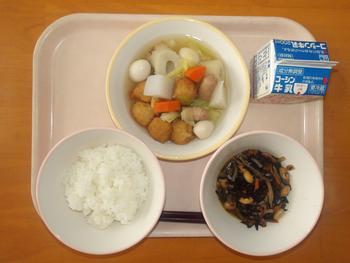 今日の給食は、「ごはん ようふうおでん ひじきのにもの ぎゅうにゅう」でした。