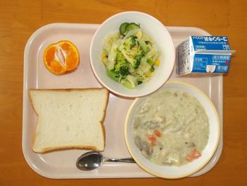 今日の給食は、「しょくパン しろいんげんまめのシチュー コーンサラダ ぽんかん ぎゅうにゅう」でした。