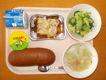 6年生が考えた献立です。「こくとうパン ポテトラザニア ブロッコリーサラダ アルファベットスープ はちみつレモンゼリー ぎゅうにゅう」でした。