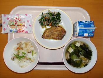 今日の給食は、「ごもくちらしずし さばのごまだれやき ほうれんそうののりあえ すましじる ひなあられ ぎゅうにゅう」でした。