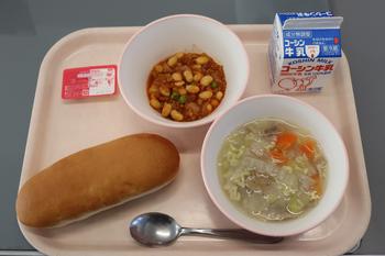 昨日の給食は、「コッペパン いちごシャムアンドマーガリン チリビーンズ アルファベットスープ ぎゅうにゅう」でした。