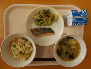 今日の給食は、「たけのこごはん さけのしおやき ごまあえ みそしる ぎゅうにゅう」でした。