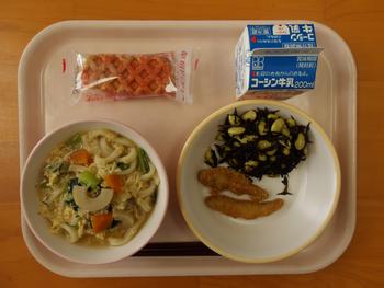 今日の給食は、「かきたまうどん チーズドック わかさぎのフリッター ひじきおあだいず ぎゅうにゅう」でした。