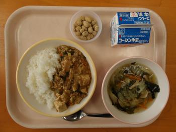 今日の給食は、「マーボーどん はるさめスープ こくとうきなこまめ ぎゅうにゅう」でした。