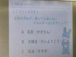 | 今日は松戸市ゼロカーボン課と京葉ガスの職員の方々にご来校いただき5年生に出前授業を行っていただきました。地球温暖化に関する話や高木小の屋根に設置された太陽光パネルの話など私たちが生活の中でできるカーボンオフセット活動についても教えていただきました。子どもたちがとても真剣に話を聞いていて最後に積極的に質問をしていたことに感心させられました。本日は子どもたちのためにありがとうございました。「明るいあいさつ かがやく笑顔 みんな仲よく高木小」 | ||