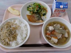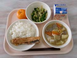 | 21 | 水 | ごはん、たくあんふりかけ、さばのねぎみそやき、こぶちゃあえ、とりやさいじる、りんご、ぎゅうにゅう | |||