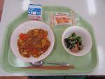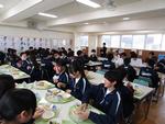 ○本日で3年生は給食が終了となりました。本日のメニューはカレーライス、サラダ、牛乳にクレープ。中学校生活最後の給食を和気藹々と和やかな雰囲気の中で味わっていました。また、下膳の後に、栄養士や調理員の方々に感謝の気持ちを伝える姿が見られ、温かな気持ちになりました。