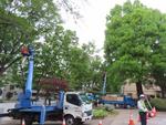 4月23日(木) 午前中に雨が降り出し、体育の授業が中断されました。新体力テストの種目も再度時間を設定しなければ・・外の競技は、天候で中断されることも学びの一つですね。 1年生も3週目に入り授業が進んでいます。英語ではLATと元気に楽しく学んでいました。国語は、金子みすずさんの「ふしぎ」から『筆者にとってのふしぎとは何か』の学習課題に自分の考えを持ち、仲間としっかりと意見を交わしていました。仲間と共に学ぶ楽しさと深まりに気づけるといいですね。 正門前のけやきの木の剪定が行われました。