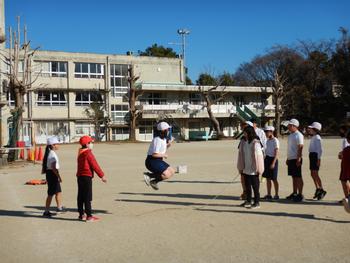 体育の時間、縄跳びに取り組んでいます。高学年は、速さとリズムが求められる長縄にも挑戦しています!