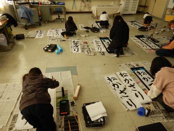 5・6年生書初め大会 5・6年生は、体育館で行いました。気温が低いため、ジェットヒーターを使用しました。5年生のお題は「羽根つき」、6年生のお題は「初春の空」です。6年生にとっては、小学校で最後の書初め大会でした!