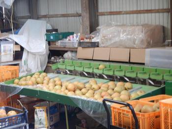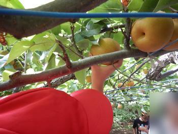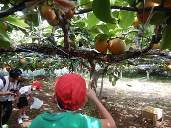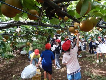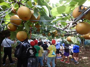 3年生 近隣のなし園を訪問しました。1学期に摘果をしたなし園です。今日は現地で高木小と合流し、なしもぎの体験をしました。今が旬の「新高」という種類のなしです。