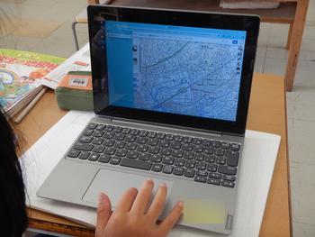 4年生社会「風水害からくらしを守る」 タブレットで松戸市のハザードマップを確認しました。