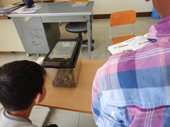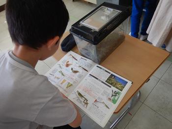 1年生生活「生き物と仲良し」 校庭で見つけた虫を観察です。図鑑で特徴を確認しました。