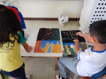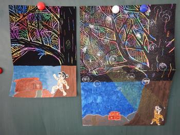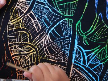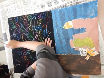3・4年生図工「スクラッチ」 国語の作品である「モチモチの木」を題材にした作品です。カラフルな色彩が浮かびあがります。