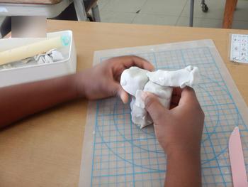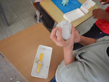 1年生図工 粘土細工です。粘土を何度もこねて、思い通りの形にしていきます。