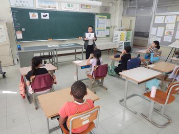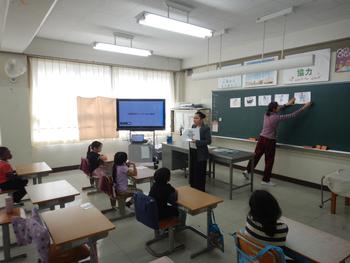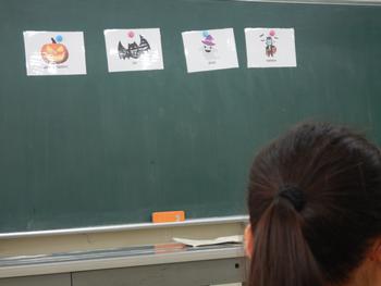 1・2年生外国語活動 LATの先生の授業です。ハロウィンにちなんだ言葉を英語で発音しました。