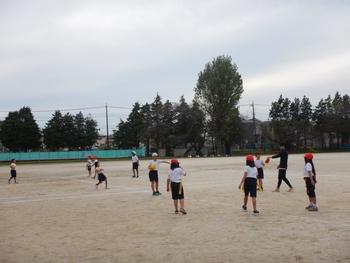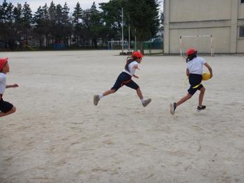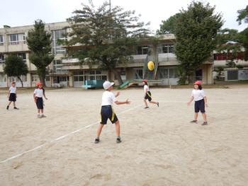 3・4年生体育「タグラグビー」 試合を始めています。4チームに分かれて全チームと対戦です!