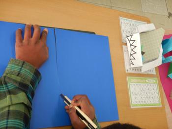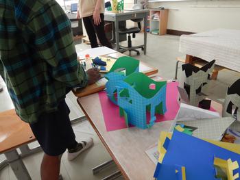 1年生図工「窓のある建物」 カッターを使用して、たくさんの窓がある建物が完成しました。