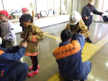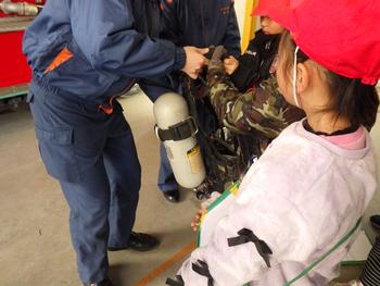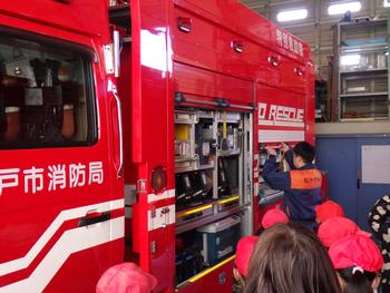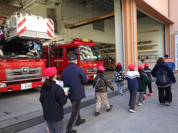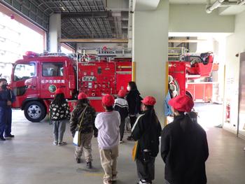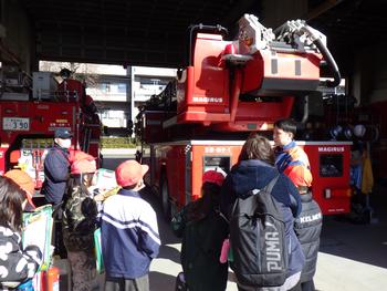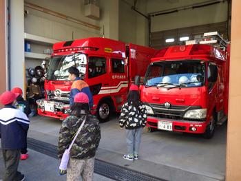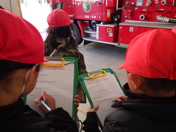 ○3年生消防署見学①…前半はいろいろな消防車の特徴について教えていただきました。消防車にはそれぞれの役割があることを学習することができました。