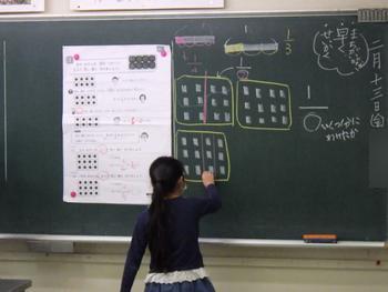 2年生算数「分数」 図を使って分数の意味を確認しています。代表者が自分の考えを黒板に記入です!