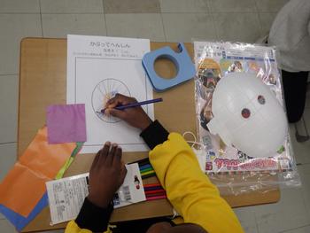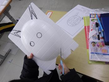 1年生図工「かぶって変身」 はさみを使用してお面を切り抜きます。これからシール付きの色がみを、お面にはっていきます。